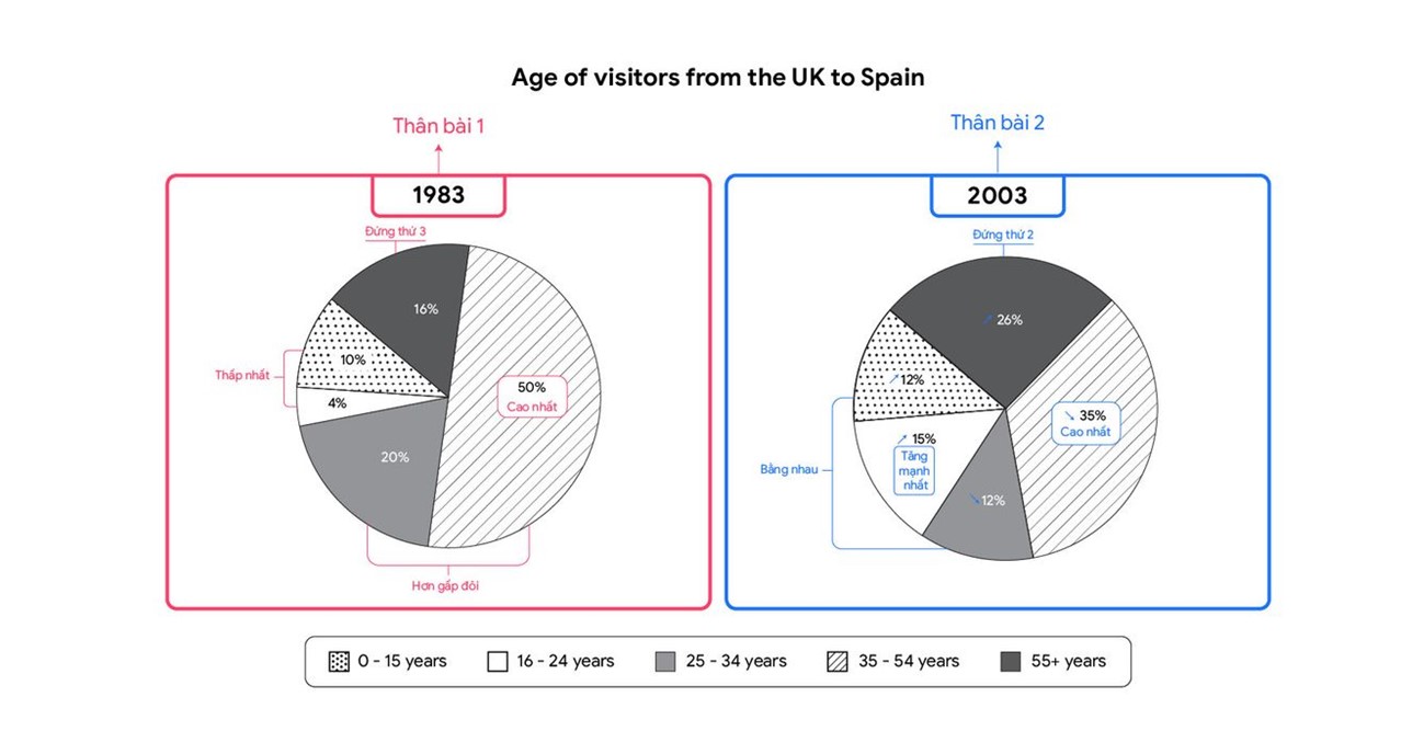 - Thời gian: 1983 và 2003 – Hai mốc cách nhau 20 năm, thể hiện rõ sự thay đổi về độ tuổi của khách du lịch Anh tới Tây Ban Nha.