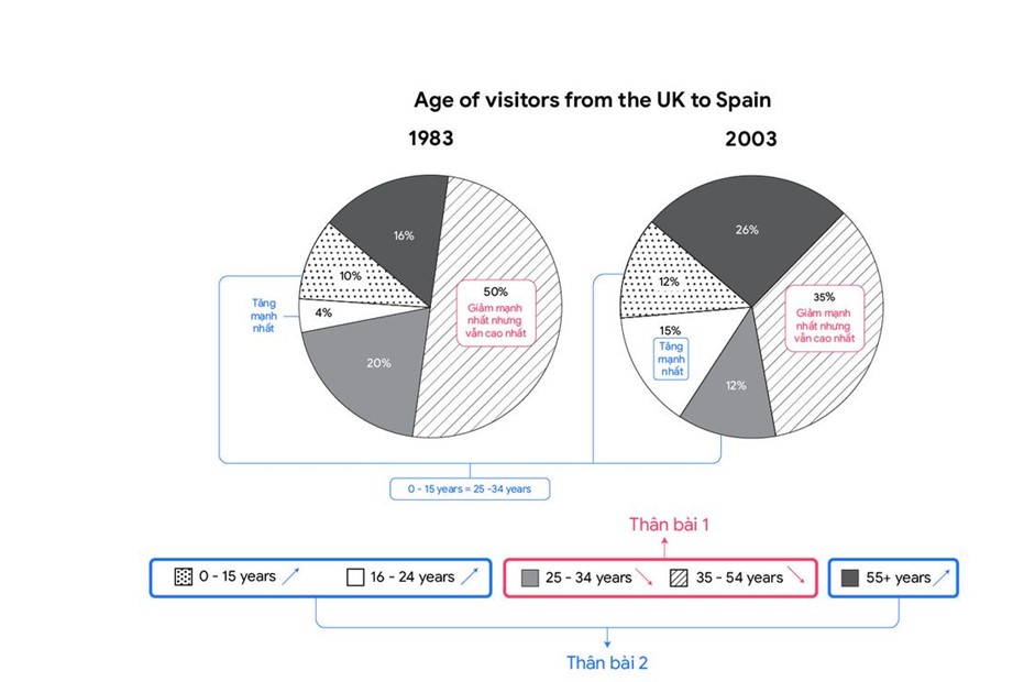 - Đối tượng so sánh chính: So sánh tỉ lệ khách du lịch từ Vương quốc Anh đến Tây Ban Nha theo độ tuổi, tại hai mốc thời gian 1983 và 2003.